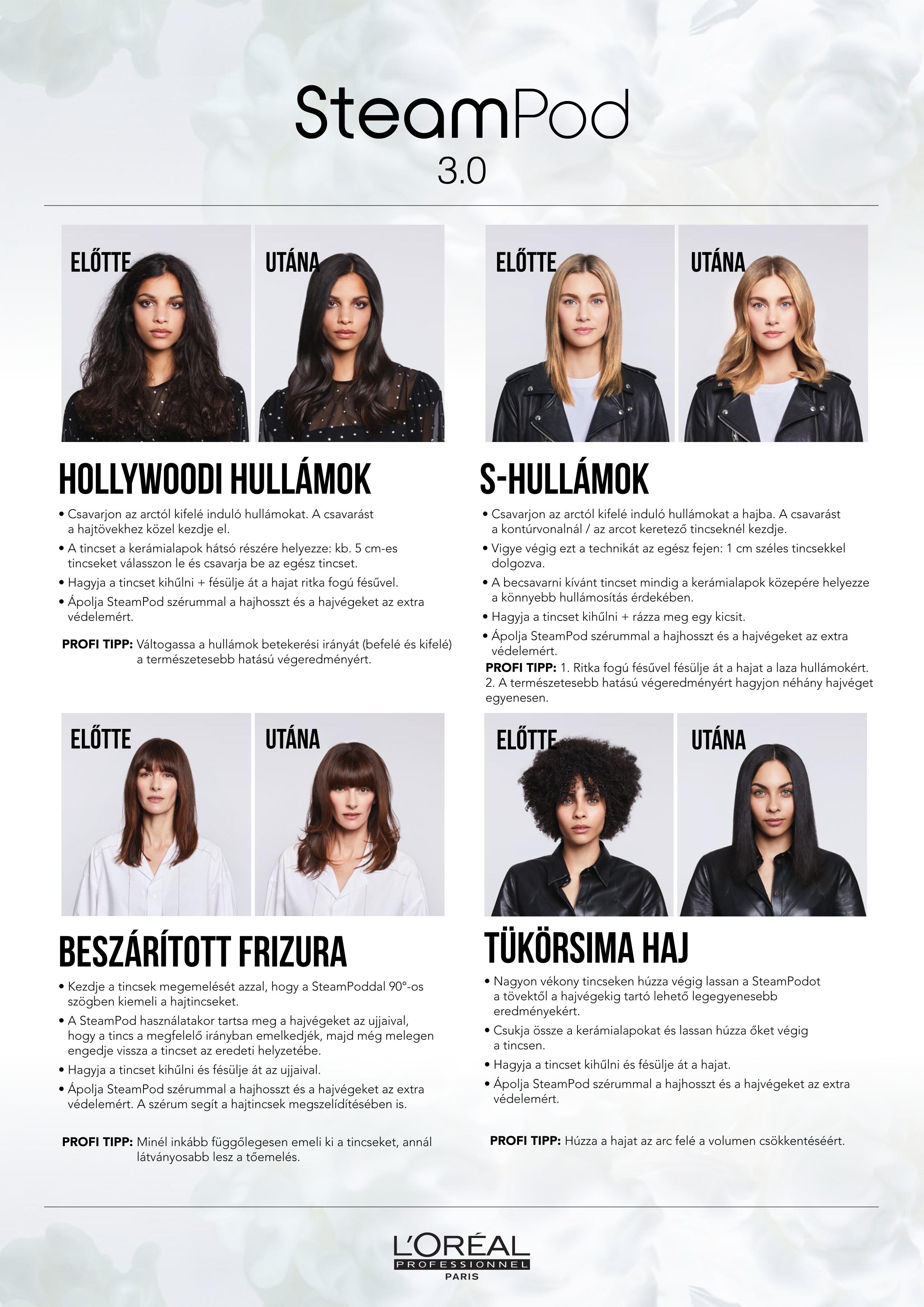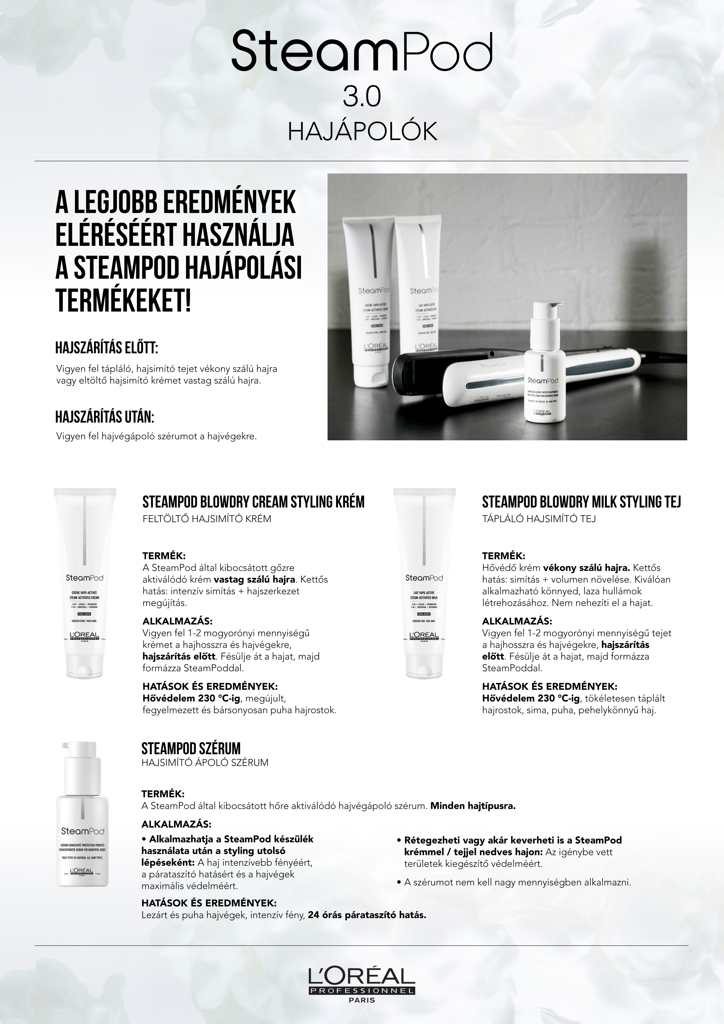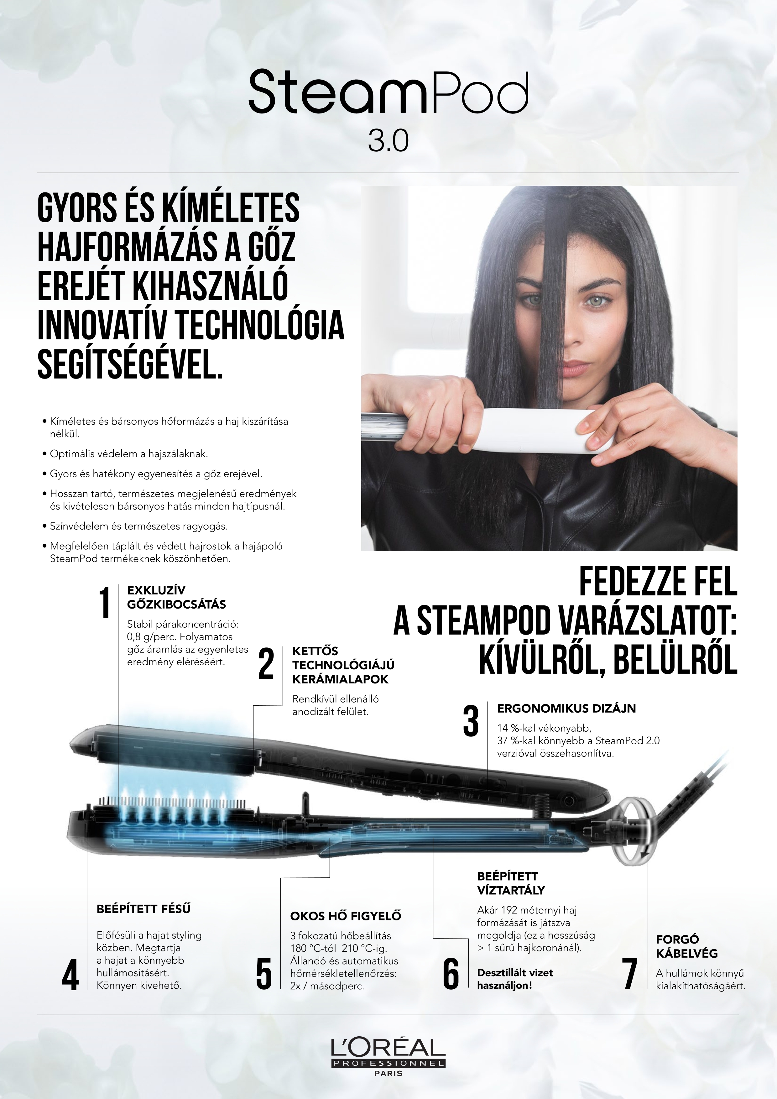 Ha tetszett a SteamPod 2.0, akkor a SteamPod 3.0-t egyszerűen imádni fogja. A könnyebb és vékonyabb dizájnnak köszönhetően a formázás még sosem volt ilyen egyszerű. A 360° fokban fordítható, extra hosszú vezeték nem csak, hogy tökéletes hajkiegyenesítést tesz lehetővé, de megkönnyíti a hullámos tincsek formázását is. A beépített víztartálynak köszönhetően pedig még egyszerűbb lett a használata és utazáskor könnyebben is szállítható.Tulajdonságok:- gyors és egyszerű formázást biztosít még a legnehezebben kezelhető haj esetében is- Tökéletesen sima vagy gyönyörűen hullámos haj? Csakis Önön múlik a választás. - kíméletes formázás a gőz erejével- védi a festett hajszínt és ragyogó fényt biztosít a számára- segít kezelhetővé tenni a hajatTechnikai specifikáció:- ergonomikus design - kényelmes fogás és könnyű használat- beépített (desztillált) víztartály 13ml, akár 192 méternyi haj formázását is játszva megoldja (ez a hosszúság két egymásra rakott Big Ben torony magasságának felel meg- intelligens hőszabályozás (másodpercenként 2x ellenőrzi a lapok hőmérsékletét) - automatikus hőbeállítás a haj igényeinek megfelelően (180–210 °C)- forgó vezeték a hajtincsek még könnyebb hullámosításáért- beépített fésű - átfésüli a hajat formázás közben (kivehető)- stabil gőzkibocsátás - folyamatos gőzáramlás az egyenletes eredmény biztosításáért- Kábel hossza: 2,4 mHasználati útmutató:1. Öntsön desztillált vizet a víztartályba. 2. Állítsa be a hajtípusnak megfelelő hőmérsékletet. Ne feledje, hogy nem szükséges, hogy a hajformázó túl forró legyen. 3. A hajformázó lapjaival fogjon össze egy hajtincset, közben ügyeljen rá, hogy a lapokon található nyilak lefelé mutassanak formázás közben. Ha nem így használjuk a hajvasalót akkor nem jön elegendő gőz a készülékből!A legjobb eredmény érdekében a hajformázót lassan mozgassa. Tippünk:A SteamPod 3.0-t a professzionális SteamPod ápoló termékekkel együtt használja az ideális hatás eléréséért. A SteamPod rutin optimális hajfelszín védelmet, 24 órás szöszösödésgátlást és sima hajszálakat biztosít a puha, fényes, természetes hatású frizuráért.