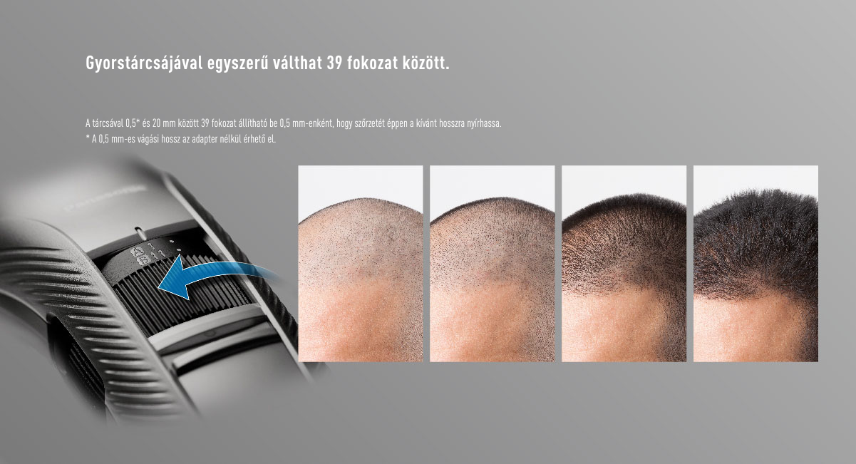 Tegye fel az adaptert, és állítsa be a kívánt hosszt. Kényelmesen nyírható a haj a tarkón és a fül körül.